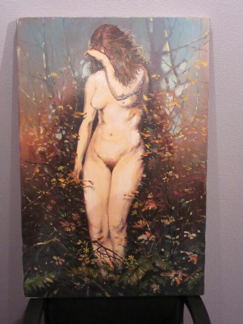 Artystyczny obraz przedstawiający nagą postać kobiecą w otoczeniu roślinności , obraz jest podpisany Warchoł 2002 , ...